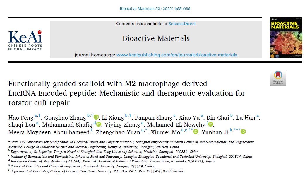 The research findings, titled Functionally graded scaffold with M2 macrophage-derived LncRNA-Encoded peptide: Mechanistic and therapeutic evaluation for rotator cuff repair, were published online in the international materials science journal Bioactive Materials. The corresponding authors of the paper are Professor Mo Xiumei and Associate Chief Physician Ji Yunhan, with co-first authors including Feng Hao, a graduate student from College of Biological Science and Medical Engineering at DHU, and Zhang Gonghao and Xiong Li, attending physicians from Shanghai Tongren Hospital.