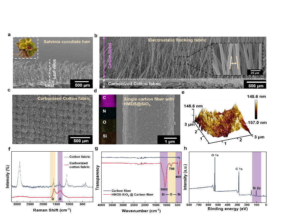Recently, the teams led by Professor Li Faxue and Professor Zhang Ruiyun from the College of Textiles at DHU, inspired by the microstructure of Salviniacucullata, constructed HMDS-SiO2 modification of the carbonized electrostatic flocking fabrics, HC-CEFF, using electrostatic flocking technology. Benefiting from the efficient photothermal and electrothermal conversion effects, the textile-based absorber facilitates heavy oil absorption. The research findings, titled “Bioinspired Design of Textile-based Absorbers: Photothermal and Electrothermal Synergistic Conversion for Efficient Clean-Up of Heavy Oil,” were published in Advanced Fiber Materials.