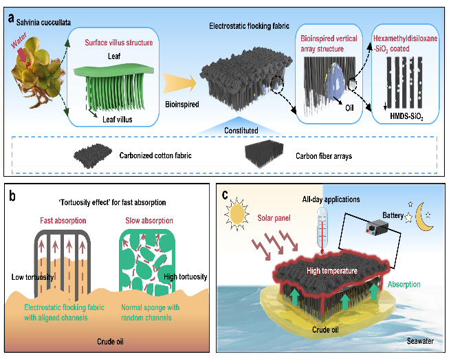 The core of this design comprises two parts: first, the vertically aligned, high-density carbon fibers possess rough hydrophobic surfaces and low tortuosity, which help reduce oil diffusion resistance and, with strong capillary forces, facilitate the rapid adsorption of heavy oil. Second, because of their excellent light absorption and electrical conductivity, the carbonized cotton fabric and vertically aligned carbon fibers achieve outstanding photothermal conversion and joule heating performance (Figure 1).