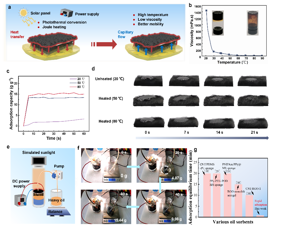 The proposed solar-heated and joule-heated textile-based absorbers with aligned channels show great potential for efficient heavy oil absorption.