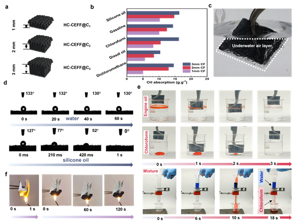 The HC-CEFF absorber exhibits excellent hydrophobicity and lipophilicity. In particular, HC-CEFF@C3 (with a carbon fiber flocking length of 3 mm) showed the highest absorption rates for all organic solvents tested (dichloromethane: 14.59 g g⁻¹, diesel: 10.36 g g⁻¹, chloroform: 16.17 g g⁻¹, gasoline: 14.36 g g⁻¹, silicone oil: 16.32 g g⁻¹).