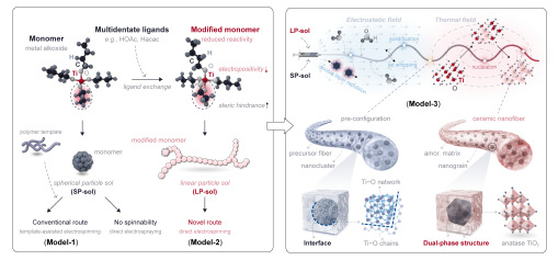 The research team developed a novel synthetic route involving coordination modification and confined hydrolysis-polycondensation of metal alkoxide monomers to produce inorganic molecular chains with linear structures. Using the titanium system as an example, the resulting linear inorganic molecular chain sol could be directly employed in electrospinning (a “self-templating” approach).