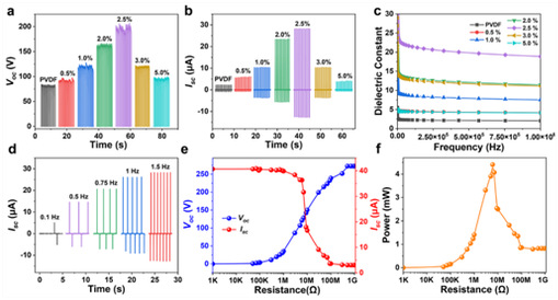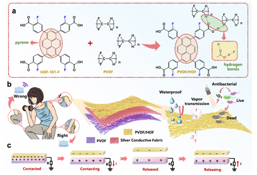 Recently, the research team led by Zhu Meifang and Cao Ran at DHU successfully incorporated hydrogen-bonded organic framework material (HOF-101-F) into polyvinylidene fluoride (PVDF) to construct PVDF/HOF composite nanofiber membranes through solution blending and fiber formation-precipitation methods. Based on this innovation, the team developed a breathable, antibacterial, and highly sensitive fiber-based triboelectric sensor (BATS) that demonstrates remarkable improvements in both output performance and antibacterial properties (Fig. 1).