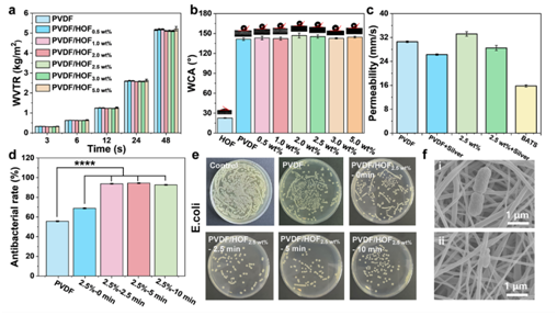 The resulting PVDF/HOF composite nanofiber membranes exhibit excellent waterproofing, moderate breathability, and demonstrate over 90% antibacterial efficacy against E. coli, effectively inducing morphological shrinkage on the bacterial surface.