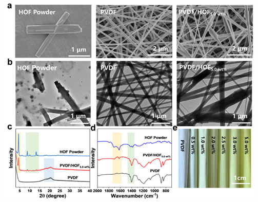 Fig. 2. Morphological and structural characterization of PVDF/HOF composite nanofibers
