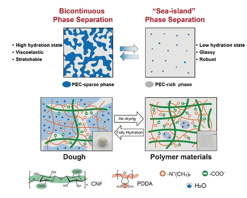 To address this limitation, a research team from Donghua University (DHU) led by Professor Wu Peiyi and Associate Researcher Hou Lei has proposed a new strategy based on water-mediated phase separation evolution. This method decouples mechanical robustness and reprocessability by leveraging different hydration states of the material. The breakthrough enables plastics that are strong and durable under normal atmospheric conditions, yet readily reprocessable at room temperature when fully hydrated.In practice, the fully hydrated material transitions into a dough-like viscoelastic state, making it easy to reshape into arbitrary forms without the need for high energy input—an eco-friendly alternative to conventional plastic processing. (Figure 1)Particularly, the plastic regains excellent mechanical performance, with tensile strength reaching 211.2 MPa and Young’s modulus up to 5.6 GPa. These values place it among the top-performing sustainable polymers capable of handling real-world, load-bearing applications.