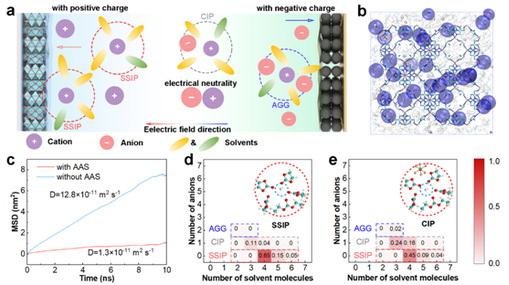 During discharge, free sodium ions and SSIPs carry positive charges and migrate toward the cathode, facilitating current transmission. In contrast, anion-containing aggregates (AGGs) migrate toward the anode, contributing negatively to current transmission and raising internal resistance (Figure 1a). To overcome this, the team carefully designed AAS to regulate bulk solvation structure, and analyzed Na⁺ solvation through stoichiometric probability density of solvated clusters. Results show that anionic anchoring effectively restricts anions and promotes SSIP formation, enabling SSIPs to act as primary charge carriers that improve charge transfer kinetics in SIBs.