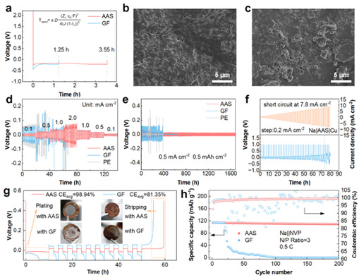 Benefiting from enhanced Na⁺ transfer kinetics, the Na||Cu battery equipped with AAS achieved a longer Sand’s time (3.55 h vs. 1.25 h for GF) (Figure 3a). In Na||Na symmetric batteries, sodium deposition after 50 cycles appeared denser and more uniform (Figure 3b), while plating/stripping tests (Figures 3d, 3e) demonstrated excellent reversibility and lower overpotential. These results indicate that AAS can reduce internal resistance, improve plating/stripping stability, increase critical current density (CCD) and CE, and maintain reversibility even under harsh low-capacity-ratio conditions—thereby enhancing anode stability, reducing cell volume, and improving energy density.