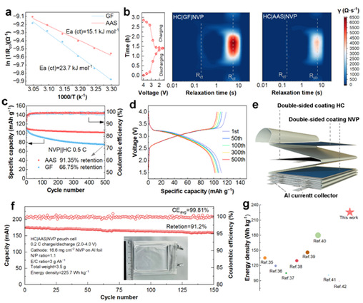 At 0.5 C, the HC|AAS|NVP full cell showed reduced capacity fading and retained 91.35% of its capacity with an average CE of 99.5% (Figure 5c). Meanwhile, the HC|AAS|NVP pouch cell achieved an impressive energy density of 225.7 Wh kg⁻¹ at 0.2 C (based on total cell mass), along with high capacity (176 mAh) and excellent cycling stability (Figure 5f). These results highlight that AAS allow SIBs to maintain cycling stability with lean electrolyte and high cathode loading, thereby reducing inactive mass and volume, lowering costs, and improving energy density.