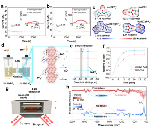 The researchers also established a nuclear magnetic resonance (NMR)-assisted Hittorf method to study ion transport under an electric field and quantify anion transfer kinetics (Figure 2d). The results verified that AAS effectively suppress PF₆⁻ migration. Although this method involves an unrealistic separator-to-electrolyte volume ratio, it suggests that the true anchoring effect of AAS may be even stronger. Complementary in-situ attenuated total reflection Fourier transform infrared spectroscopy (ATR-FTIR) further confirmed the impact of AAS on ion transport behavior.