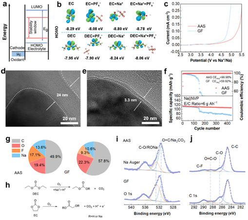 Furthermore, anions are known to lower solvent oxidative stability, compromising cathode electrolyte interphase (CEI) integrity. Linear sweep voltammetry (LSV) showed that confining anions raises oxidation potential, mitigating parasitic reactions on the cathode side (Figure 4c). With AAS, a thinner and more uniform CEI was formed. At low electrolyte-to-cathode ratios, the Na|AAS|NVP battery exhibited superior cycling stability, as AAS alleviated cathode failure risks and reduced side reactions (Figure 4f). X-ray photoelectron spectroscopy (XPS) further revealed that CEI films in the GF system contained higher organic and lower inorganic content, making them thicker and more resistive than those formed in the AAS system (Figures 4i, 4j). This demonstrates that AAS improve solvent oxidative stability and enable formation of a stable CEI.