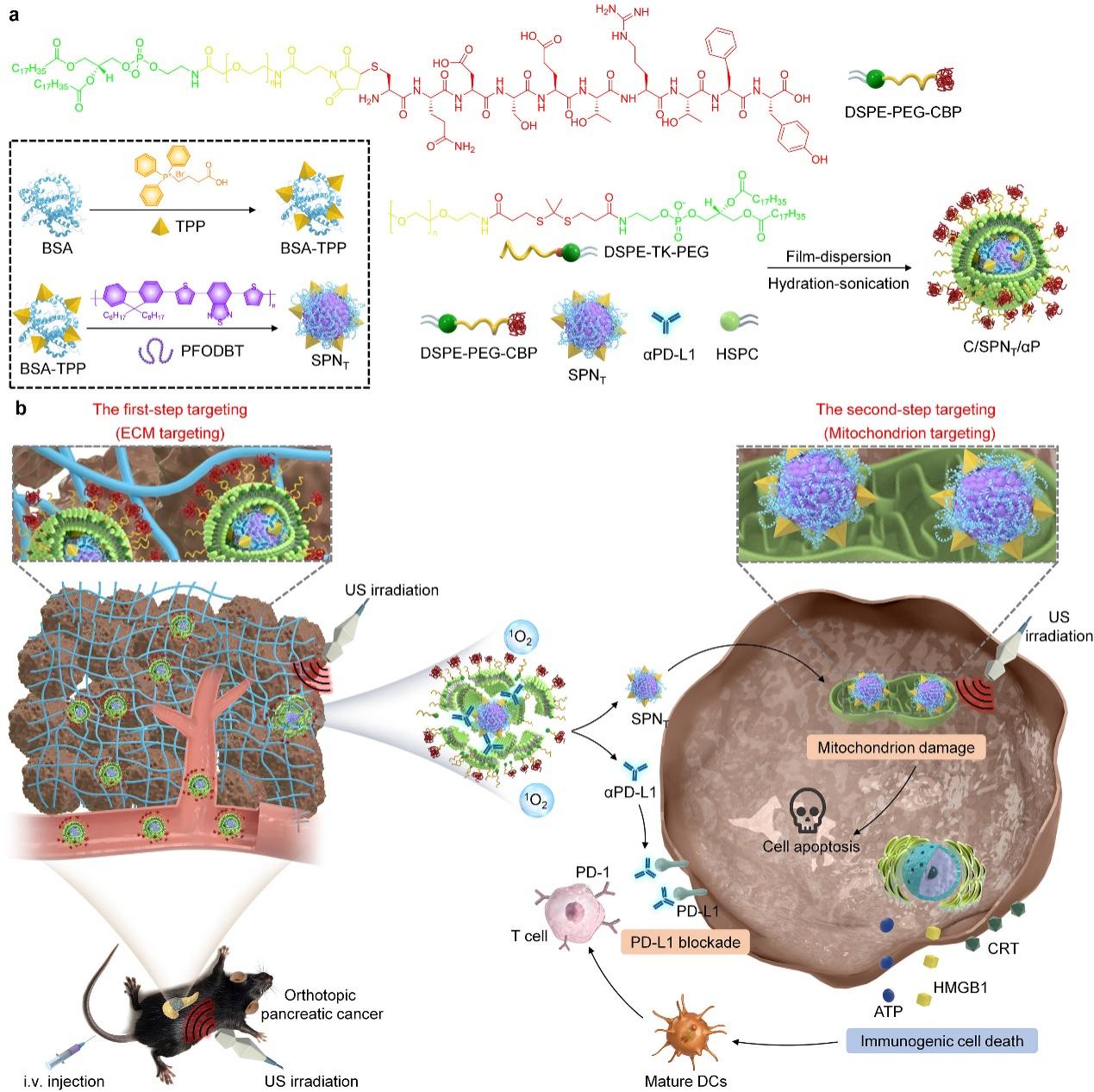 For orthotopic pancreatic cancer, the team constructed a semiconducting nanoswitch (C/SPNT/αP) capable of amplifying mitochondrial damage and PD-L1 blockade. This nanosystem embeds small nanoparticles (SPNT) containing a mitochondrial-targeting ligand (TPP) and semiconducting polymer (SP), together with αPD-L1, into ultrasound-responsive nanoliposomes conjugated with a collagen-binding peptide (CBP) for extracellular matrix targeting. In the first step, CBP facilitates accumulation of C/SPNT/αP at the pancreatic tumor site. Under ultrasound irradiation, the shell ruptures through sonodynamic therapy (SDT), releasing SPNT and αPD-L1. Subsequently, SPNT achieves mitochondrial targeting and enhances apoptosis via ^1O2 generation, thereby promoting immunogenic cell death (ICD). This immunostimulatory effect is further amplified by αPD-L1, which blocks the PD-L1 immune checkpoint (Fig. 2). This combined sonodynamic and immunotherapy approach exhibited strong antitumor efficacy in Panc02 and KPC orthotopic pancreatic cancer models, achieving effective tumor suppression by enhancing both ICD and T-cell activation. These findings were published in Advanced Functional Materials under the title “Two-Step Targeting-Tunable Semiconducting Nanoswitches Amplify Mitochondrion Damage and PD-L1 Blockade for Orthotopic Pancreatic Cancer Therapy.”