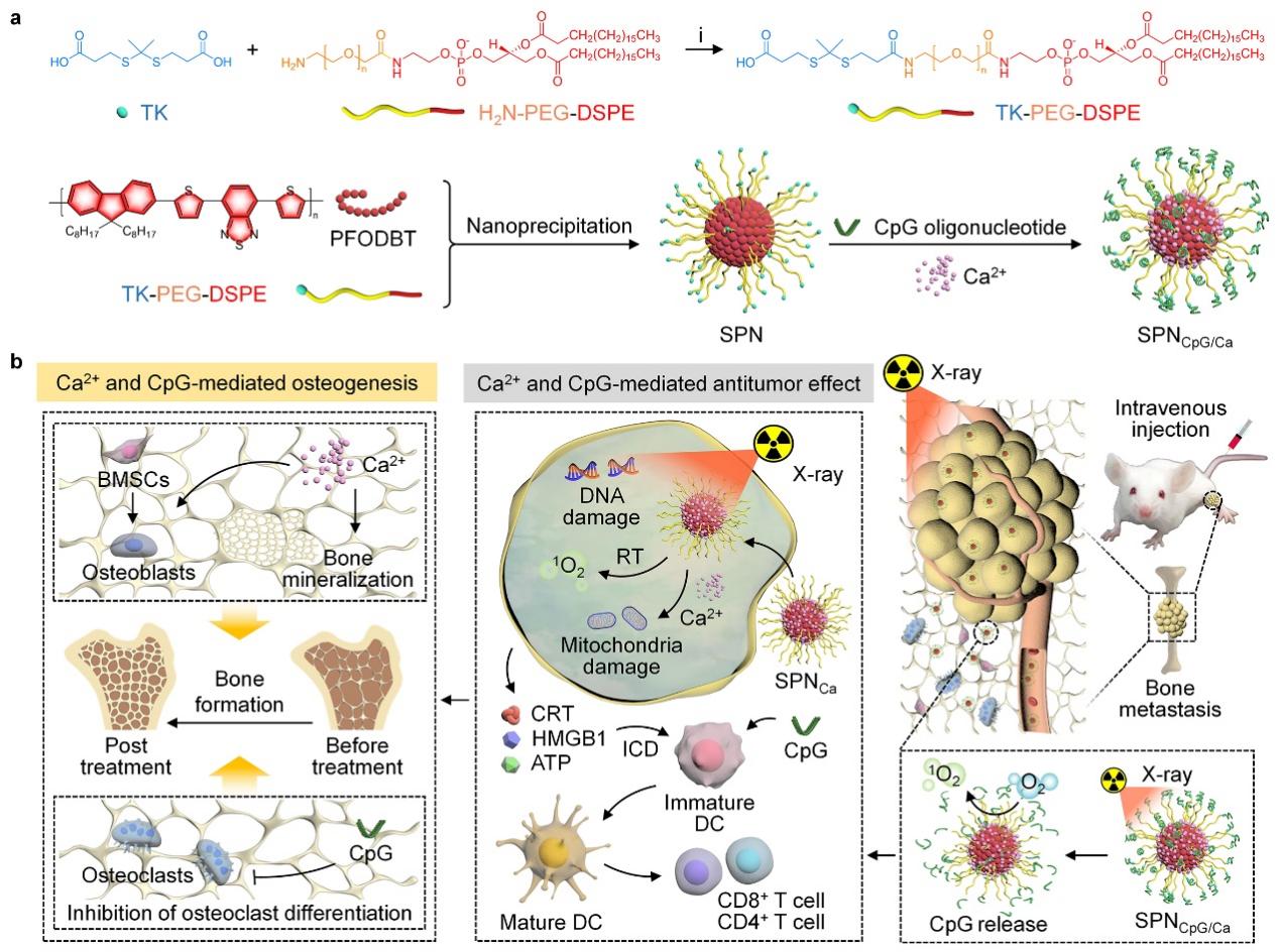 In tackling the challenge of bone metastasis treatment, the team designed a multifunctional semiconducting nanointegrator (SPNCpG/Ca) that synergizes radiotherapy, calcium overload, and immunotherapy.The system features a semiconducting polymer nanoparticle (SPN) core that functions as both a radiosensitizer and a 1O2 generator under X-ray irradiation. The reactive oxygen species produced not only exert direct radiotherapeutic effects but also cleave thioketal linkers to release immunoadjuvant CpG oligonucleotides. This coordinated mechanism induces immunogenic cell death and activates antitumor immunity through dendritic cell maturation. In breast cancer bone metastasis models, this platform achieved complete tumor regression and suppressed hepatic and pulmonary metastases. Moreover, the released Ca2+ promoted osteogenic differentiation of bone marrow mesenchymal stem cells, while CpG oligonucleotides inhibited osteoclastogenesis, collectively contributing to bone tissue regeneration (Fig. 1).This work, published in Advanced Functional Materials under the title “Breast Cancer Bone Metastasis Therapy and Tumor-Associated Bone Destruction Repair by Versatile Semiconducting Nanointegrators with X-Ray Adjuvant.”, presents a comprehensive strategy for simultaneous treatment of bone metastases and repair of osseous defects.