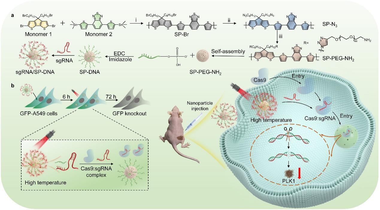 To address the clinical challenge of achieving specific enrichment of CRISPR systems at lesion sites while minimizing off-target effects, the team developed a near-infrared (NIR) light-responsive organic polymeric nanocarrier for CRISPR activity regulation and tumor gene therapy. By grafting single-stranded DNA (ssDNA) complementary to the target region of the sgRNA onto a semiconducting polymer (SP) with strong photothermal conversion performance, they created an ssDNA-modified carrier (SP-DNA). The ssDNA on SP-DNA hybridizes with sgRNA to form a nano-system, which functions as both a delivery vehicle and an NIR photothermal conversion medium. Under NIR irradiation, localized heating causes the dissociation of sgRNA from ssDNA, releasing free active sgRNA and enabling precise regulation of CRISPR/Cas9 activity (Fig. 3). This strategy significantly reduces off-target effects while maintaining high gene editing efficiency, as demonstrated in tumor models. The research was recently published in Nano Letters under the title “A Semiconducting Polymer NanoCRISPR for Near-Infrared Photoactivatable Gene Editing and Cancer Gene Therapy.”