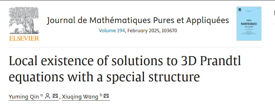Professor Qin Yuming from the School of Mathematics and Statistics at Donghua University has recently achieved a significant breakthrough in the theoretical study of the 3D Prandtlequations. The research findings have been published in the renowned journal Journal de Mathématiques Pures et Appliquées, with Donghua University listed as the first institution and Professor Qin as the first author. The paper is titled “Local existence of solutions to 3D Prandtl equations with a special structure”.