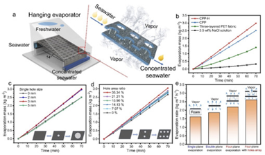 When deployed in an inclined configuration between water supply and collection tanks, the fabric enables simultaneous evaporation from four interfaces: the upper and lower surfaces of both the top and bottom layers (Planes I–IV). Vapor generated from the inner planes diffuses through the microporous upper layer, mimicking stomatal transpiration, while brine is continuously drained by gravity (Figs. 1d, 3). Under one-sun irradiation, the fabric achieves an evaporation rate of 2.6 kg m⁻² h⁻¹, significantly outperforming conventional floating evaporators (1.6 kg m⁻² h⁻¹) and hanging evaporators (1.9–2.2 kg m⁻² h⁻¹).