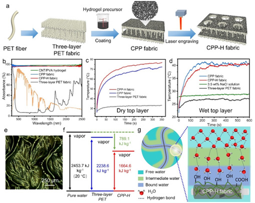 The CPP-H fabric demonstrates exceptional photothermal properties, achieving 96.1% solar absorption with minimal thermal loss (Fig. 2). Surface functionalization introduces polar groups that reduce water evaporation enthalpy through hydrogen bonding and electrostatic interactions, enhancing vapor generation efficiency.
