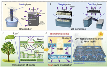 Inspired by the structure and transpiration process of plant leaves (Fig. 1c), the researchers designed a breathable 2D photothermal fabric with a three-layer configuration capable of four-plane evaporation (Fig. 1d). The top and bottom layers consist of parallel hydrophilic PET fabrics coated with carbon-nanotube/poly(vinyl alcohol)-based hydrogel (CNT/PVA), with the upper layer perforated to create a stomatal-like channel. The resulting CNT/PVA-hydrogel-coated polyester fabric with hole array (CPP-H) exhibits biomimetic leaf-like characteristics (Fig. 2a).