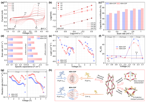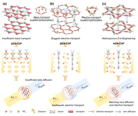 To address this challenge, the Donghua University team adopted a heteropore engineering strategy to design donor–acceptor (D–A) type covalent organic frameworks (HDA-COFs) using a one-pot Schiff base reaction. Heteroporous covalent organic frameworks (HCOFs)—a class of COFs characterized by kgm topology and multiple pore structures—have shown great promise as cathode materials for high-performance LIBs. Their diverse pore environments and unique size effects provide an ideal structure for achieving both efficient charge transport and high energy storage capacity. By rationally designing HCOFs to simultaneously enhance electronic conductivity (σₑ)and ion diffusion (σᵢₒₙₛ), researchers can unlock new possibilities for creating high-rate, fast-charging cathode materials that deliver exceptional performance and stability.