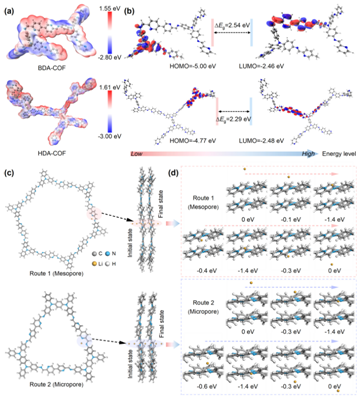 HDA-COF demonstrated a narrower band gap (2.29 eV) and a higher HOMO energy level (-4.77 eV), resulting in an electronic conductivity of 5.1×10⁻¹⁴ S/cm, outperforming other COF materials. The findings reveal that the heteroporous architecture of HDA-COF effectively promotes donor–acceptor (D–A)–type electron conduction, enhancing overall charge mobility. Further ion binding energy analyses showed that the hexagonal mesopores facilitate rapid ion diffusion, while the triangular micropores strengthen Li⁺ binding but moderately limit transport kinetics. Together, these dual pore structures work synergistically to achieve efficient charge transfer and balanced electrochemical performance.