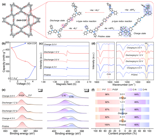 By combining DFT calculations with a series of ex situ spectroscopic analyses, the research team verified the active sites and bipolar redox behavior of both BDA-COF and HDA-COF frameworks (Figure 4). The results revealed that pyridine and imine sites can coordinate with up to four Li⁺ ions during discharge, while triphenylamine units reversibly interact with PF₆⁻ anions during charging. Ex situ electron paramagnetic resonance (EPR) spectra further demonstrated reversible changes in radical signal intensity throughout charge–discharge cycles, confirming stable redox activity. Complementary FT-IR and X-ray photoelectron spectroscopy (XPS) analyses provided additional evidence of the reversible intercalation and deintercalation of C═N (n-type) and PF₆⁻ (p-type) species across both high- and low-voltage regions. Together, these findings conclusively establish a clear, reversible bipolar reaction mechanism within the COF materials, underscoring their potential for high-performance energy storage applications.