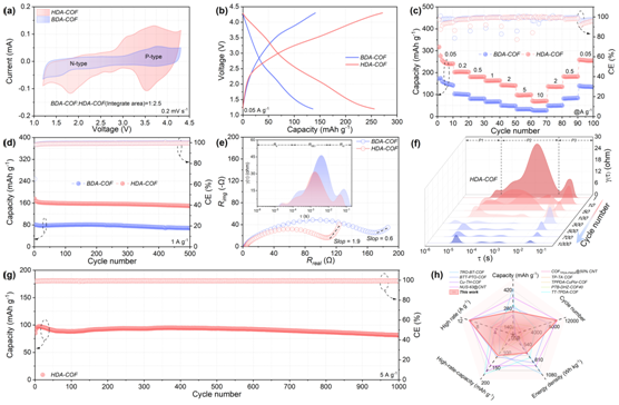 Benefiting from heteroporous D-A engineering, HDA-COF demonstrated significantly enhanced electrochemical performance (Figure 5). It delivered a discharge capacity of 251 mAh g⁻¹ at 0.2 A g⁻¹, surpassing BDA-COF (220 mAh g⁻¹), and maintained 71 mAh g⁻¹ even at 10 A g⁻¹, demonstrating excellent rate capability. After 500 charge–discharge cycles, HDA-COF retained 85% of its capacity, far exceeding the 49% retention observed for BDA-COF. Electrochemical impedance spectroscopy (EIS) revealed a lower charge-transfer resistance (11.5 Ω) and a higher ion diffusion rate, confirming that the heteroporous framework effectively enhances electron/ion transportand reaction reversibility, thereby ensuring long-cycle stability and high-rate performance, even under heavy loading conditions.