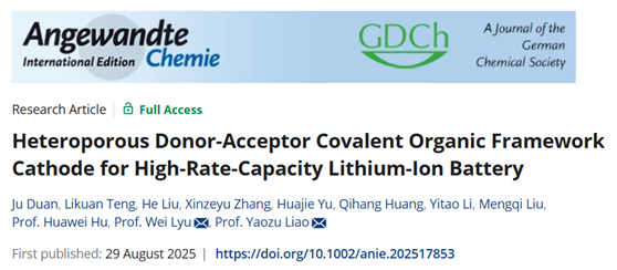 A research team from Donghua University’s College of Materials Science and Engineering and the State Key Laboratory of Advanced Fibers and Polymer Materials, led by Professors Liao Yaozu and Lü Wei, has achieved a major breakthrough in the development of cathode materials for high-rate, fast-charging lithium-ion batteries (LIBs). Duan Ju, a doctoral student at Donghua University’s College of Materials Science and Engineering, is the first author of the study, with Professors Liao Yaozu and Lü Wei serving as corresponding authors. The team’s findings were recently published as a Hot Paper in Angewandte Chemie International Edition under the title “Heteroporous Donor–Acceptor Covalent Organic Framework Cathode for High-Rate-Capacity Lithium-Ion Batteries.” The team’s innovative design of heteroporous covalent organic frameworks (HCOFs) could pave the way for next-generation lightweight and high-capacity energy storage systems.