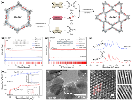 Nitrogen adsorption testing revealed that HDA-COF possessed an exceptional specific surface area of 922 m²/g and 51% porosity, outperforming the BDA-COF’s 224 m²/g and 13% porosity. Transmission electron microscopy (TEM) confirmed the highly crystalline hexagonal pore structure consistent with theoretical AA stacking predictions, further validating the success of the heteroporous design.