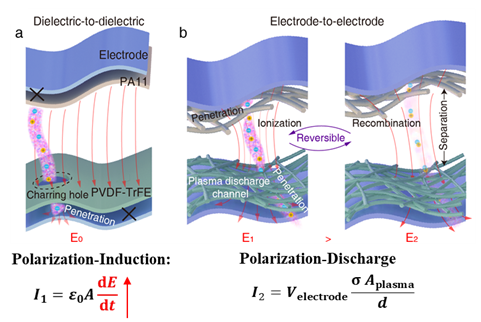 Thus, electric field breakdown is redefined as a utilizable and controllable energy release mechanism. Through precise design of the discharge threshold and channel morphology, plasma periodically forms and dissipates on the dielectric surface, avoiding material damage while achieving stable energy transfer. Experimental results show that this design effectively reduces the equivalent impedance of the dielectric layer, lowering the output characteristics from the meg-ohm level to the ohm level. Under 2 Hz low-frequency mechanical excitation, the PEET achieved a current density of 2.5 A·cm⁻² and an energy conversion efficiency of 19%, representing an improvement of two orders of magnitude compared to traditional triboelectric and piezoelectric systems.