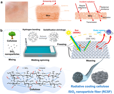 Recently, the research team led by Researcher Kong Weiqing and Professor Zhu Meifang from the College of Materials Science and Engineering and the State Key Laboratory for Advanced Fiber Materials, DHU drew inspiration from the multilayered structure and thermoregulatory mechanism of human skin to design cellulose/SiO₂ nanoparticle radiative fibers (RCSF) resembling skin-wrinkle structure (Figure 1).