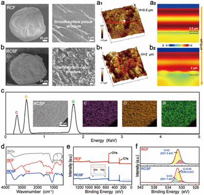 The RSCF surface displays unique skin-wrinkle-like protrusions (height ≈ 2.0 μm), with a micro-nano hierarchical roughness four times greater than that of the pristine RCF.
