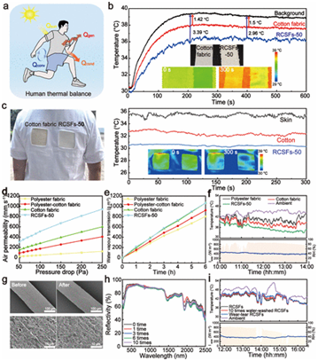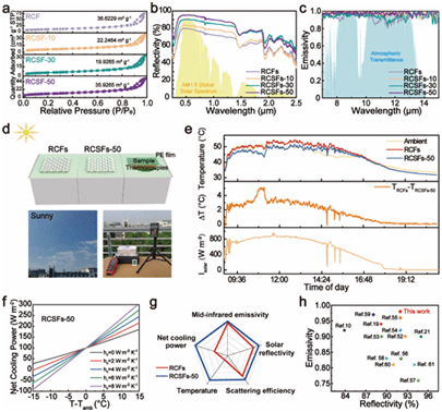 Through optical and outdoor performance tests(Figure 3), RCSF demonstrates excellent radiative cooling performance, achieving a synergy of high solar reflectivity (93.7%) and high infrared emissivity (0.98). Simultaneously, it achieves a net cooling power of 100.1 W/m² under 800 W/m² solar irradiation outdoors, leading to a 5 °C temperature reduction compared with regenerated cellulose fibers (RCF).