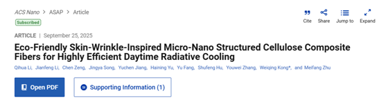 Doctoral student Li Qihua from the College of Materials Science and Engineering, DHU is the first author of the paper. The corresponding author is Associate Researcher Kong Weiqing. The related findings were recently published in ACS Nano titled Eco-Friendly Skin-Wrinkle-Inspired Micro-Nano Structured Cellulose Composite Fibers for Highly Efficient Daytime Radiative Cooling. This work was financially supported by Shanghai Oriental Talents Youth Program.