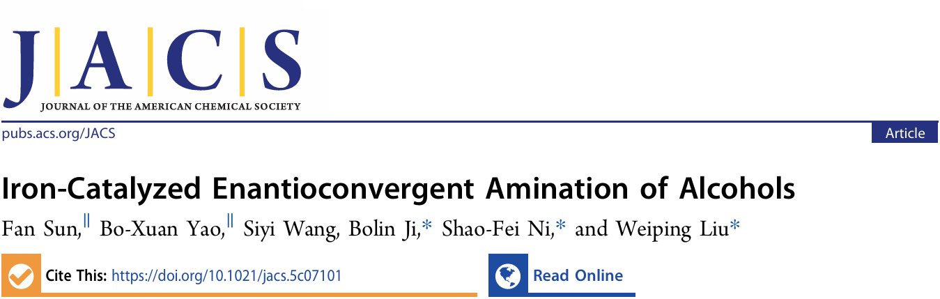 The research team led by Professor Liu Weiping and Associate Professor Ji Bolin from the College of Chemistry and Chemical Engineering at Donghua University has recently achieved an important breakthrough in the field of earth-abundant metal-catalyzed borrowing hydrogen reactions. The team successfully realized the asymmetric borrowing hydrogen amination of secondary alcohols using an iron catalyst, offering a new strategy for the efficient synthesis of chiral amine compounds. The research, entitled “Iron-Catalyzed Enantioconvergent Amination of Alcohols,” was published in Journal of the American Chemical Society (JACS).