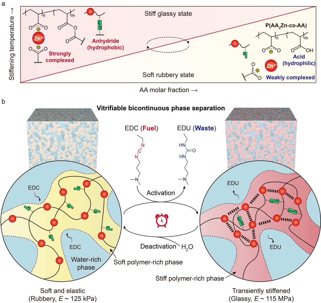 In this paper, the research team introduces a novel strategy that couples vitrifiable phase separation with non-equilibrium chemistry to significantly enhance the mechanical properties of transiently stiffened materials. Unlike traditional transient materials, which are based on either supramolecular assemblies or relatively homogeneous structures, our synthesized P(AA2Zn-co-AA) copolymer hydrogel features a thermal-stiffening bicontinuous phase separation. The addition of EDC triggers the transient conversion of AA units into hydrophobic anhydrides, which dramatically reduces the stiffening temperature. This leads to the instant vitrification of polymer-rich phase, transforming the initial soft hydrogel into a stiff glassy state with an ultrahigh modulus of 115 MPa. The stiffened modulus is unparalleled among current artificial transient materials. Furthermore, the lifetime of this transient hydrogel can be finely tuned by adjusting EDC concentration. We anticipate that, this phase separation-mediated non-equilibrium chemistry will pave the way for creating advanced transient materials that more precisely mimic living systems.